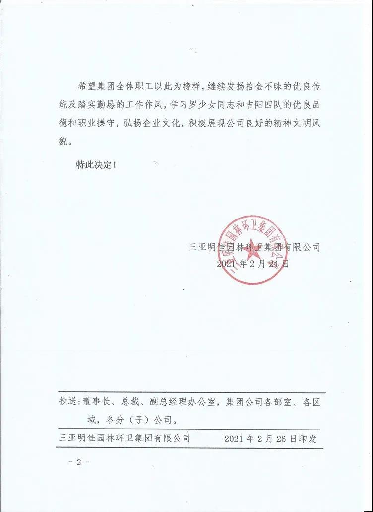 為表彰羅少女同志拾金不昧的精神,三亞明佳園林環(huán)衛(wèi)集團(tuán)有限公司于2021年2月25日 15:30時(shí),在集團(tuán)公司三樓會(huì)議室召開拾金不昧表彰大會(huì)。明佳集團(tuán)黨支部書記、董事長陳明,黨支部副書記、總裁陳云及20名員工代表參加會(huì)議。