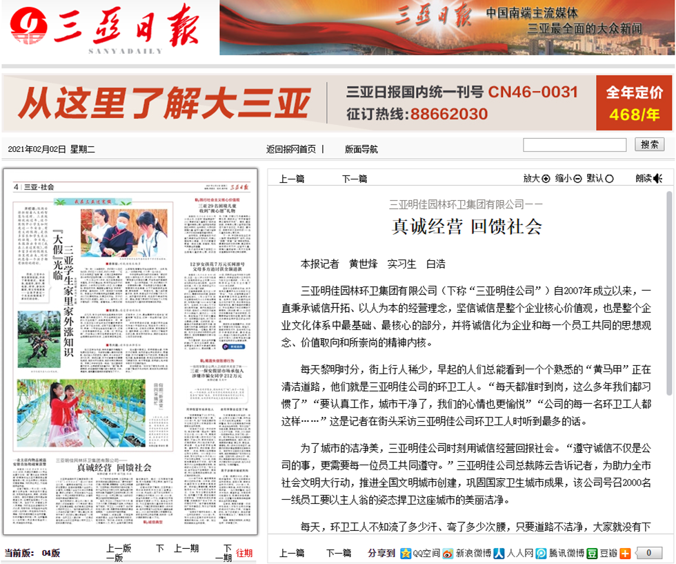 三亞明佳園林環(huán)衛(wèi)集團(tuán)有限公司(下稱“三亞明佳公司”)自2007年成立以來,一直秉承誠信開拓、以人為本的經(jīng)營理念,堅(jiān)信誠信是整個(gè)企業(yè)核心價(jià)值觀,也是整個(gè)企業(yè)文化體系中···